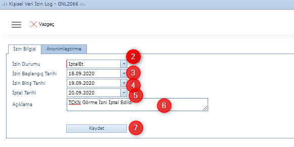 1.İzin verilen ekranda menüden KVKK İşlemlerine tıklanır. 2.İzin Durumu iptal et olarak seçilir. 3.İzin Başlangıç Tarihi girilir. 4.İzin Bitiş Tarihi girilir. 5.İptal Tarihi girilir. 6.İzin durumu ile ilgili Açıklama girilir. 7.Kaydetmek isteniyor ise Kaydet, vazgeçmek isteniyor ise Vazgeç butonuna tıklanır. |